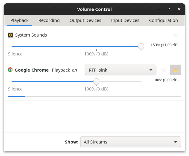 Observe que, neste exemplo, o áudio do Google Chrome está sendo enviado ao RTP_sink que, por sua vez, encaminha os dados através de pacotes RTP pela rede.