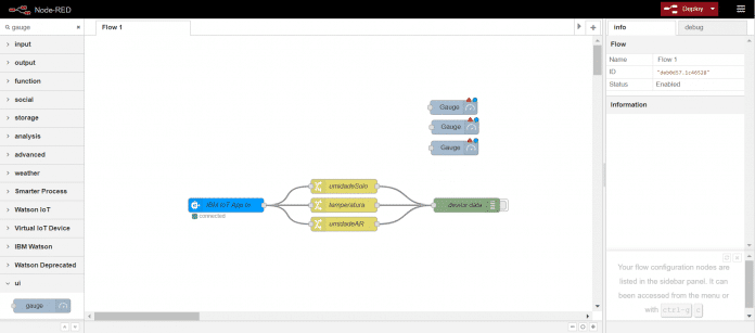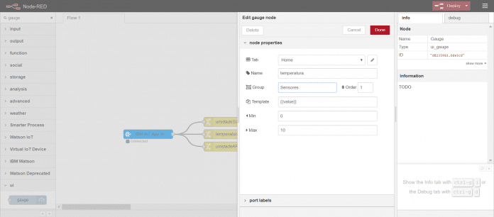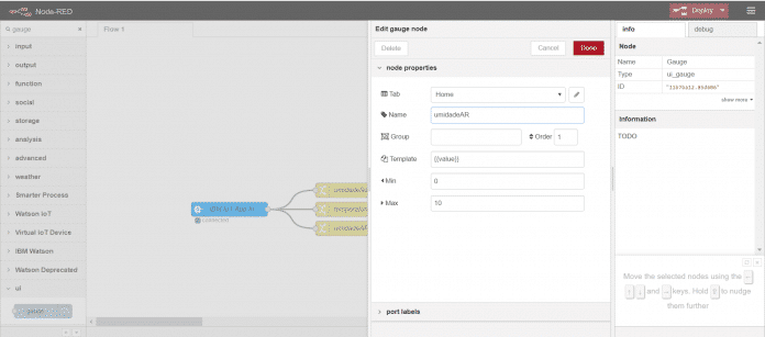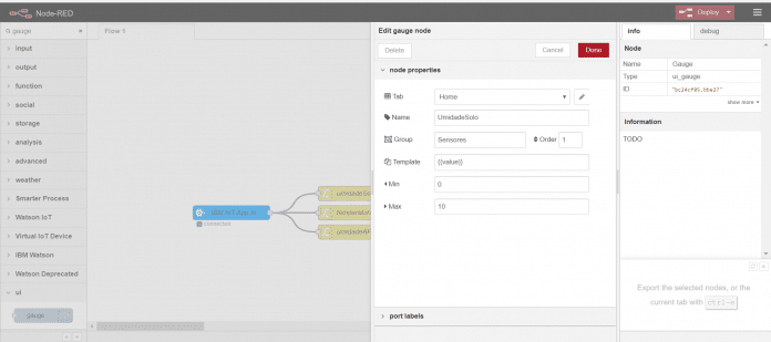 Arraste 3 balõezinhos de Gauge para o node-red