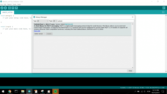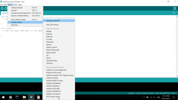 É necessário instalar a lib PubSubClient na IDE do Arduino. Para isso clique em Sketch > Include Library > Manage Libraries.