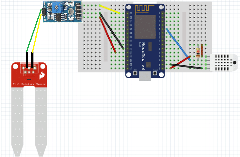 Monte o circuito na protoboard conforme a figura a seguir. Utilize o pino D4 para o dispositivo DHT11, pino 3 (dispositivo azul) e o pino A0 para o sensor de umidade de solo, pino 1. Ligue a alimentação de ambos os sensores, GND e 3V nos sinais do NodeMCU. Entre os pinos 3 e 4 do sensor DHT11, coloque um resistor de 10k.