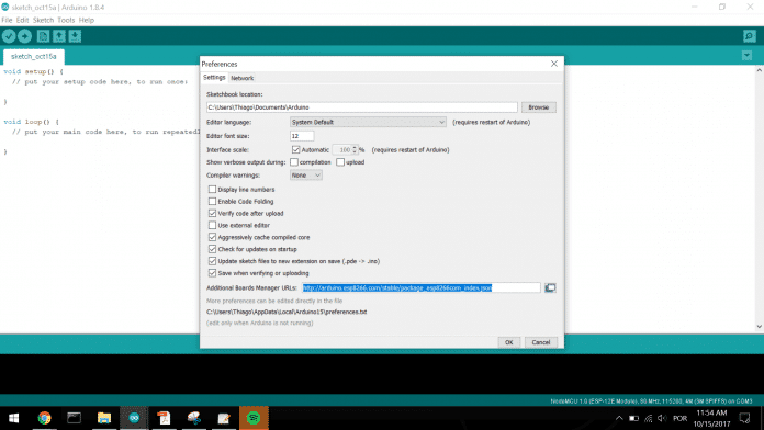 Abra a IDE do Arduino e instale o Plugin para NodeMCU. Para isso selecione File > Preferences e na opção Additional Boards Manager URLs coloque o seguinte endereço: