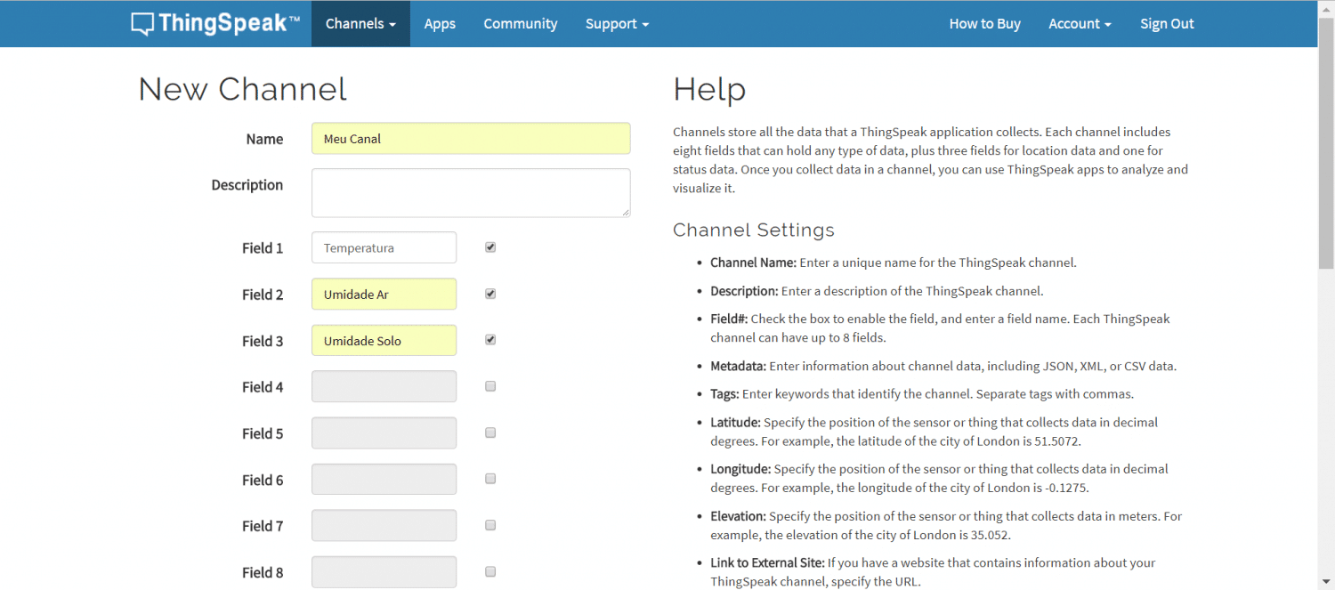 Crie um novo canal no ThingSpeak clicando em New Channel. Na aba Settings configure o Canal como a imagem a seguir: