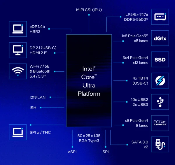 Os processadores Intel® Core™ Ultra são projetados para oferecer experiências imersivas onde quer que você vá, apresentando gráficos de nível discreto, a melhor conectividade da categoria,5 e tecnologia de mídia aprimorada. Com uma GPU Intel® Arc™ integrada, a IA potencializa a criação e a jogabilidade avançadas. Aproveite o alto desempenho necessário para criação acelerada de conteúdo e jogos imersivos de alta resolução, mesmo em movimento. Combine isso com codificação e decodificação AV1, HDMI 2.1,15 DisplayPort 2.1, suporte para quatro monitores 4K simultâneos, um novo DSP de áudio e você obtém experiências visuais e de áudio dignas do título premium! A imersão também significa conexão fácil e confiável com periféricos e a internet! A tecnologia Thunderbolt™ 4 integrada permite que você conecte vários monitores, armazenamento, carregamento e outros periféricos, enquanto o suporte para Intel® Wi-Fi 7 e Intel® Wi-Fi 6E e Bluetooth 5.4 e 5.3 oferece desempenho sem fio supercarregado e permite jogabilidade online imersiva e sem interrupções. A tecnologia Intel® Double Connect aprimora sua experiência de jogo Wi-Fi ao conectar-se simultaneamente em duas bandas Wi-Fi e priorizar o tráfego de jogos na banda mais rápida!