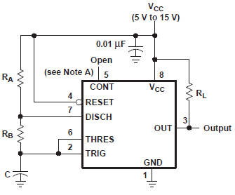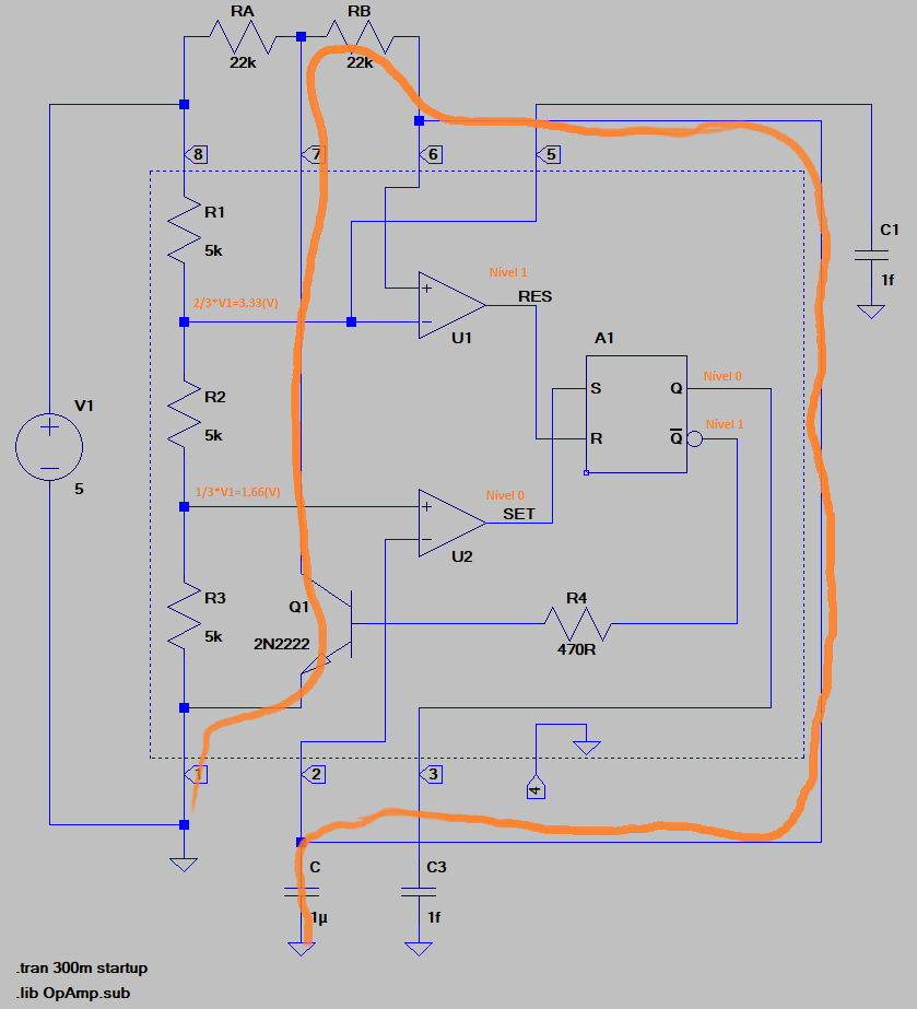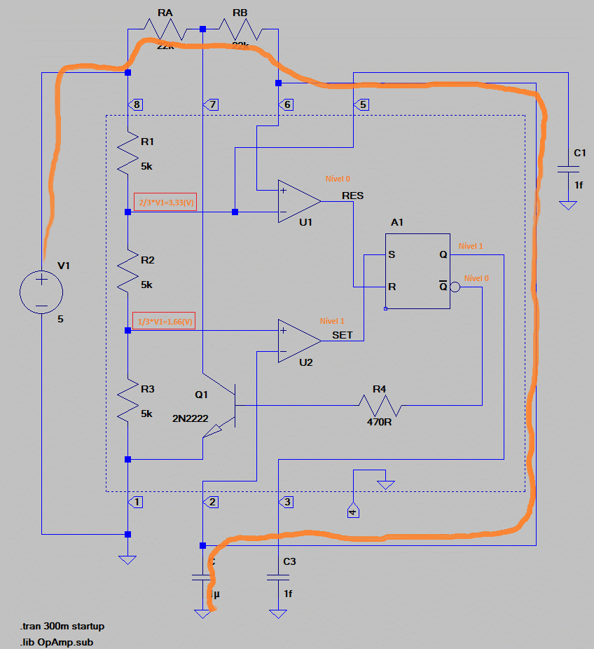Devido nossa configuração, Oscilador Astável, a tensão da curva de carga é conectada em dois pontos (pino 2 e 6), cujo potencial estão sendo comparados com as referências internas (ver circuito). No comparador inferior temos 1/3 da alimentação (1,66 Volts), então, comparado com potencial inicial de carga, fornece um nível ‘1’ em sua saída, que é um sinal de ‘Set’ para o Flip-Flop RS.