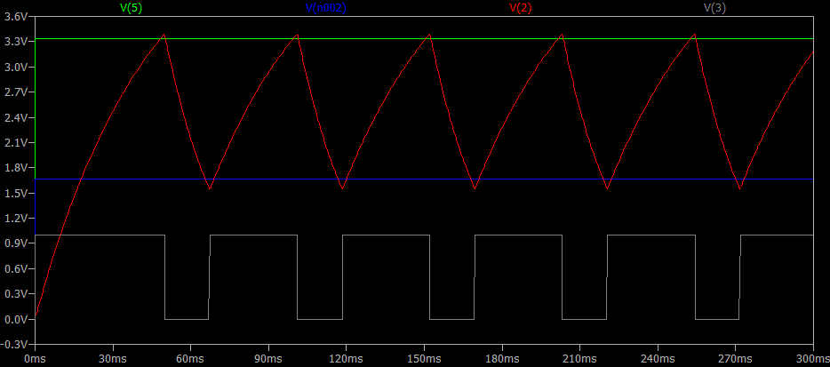 Faremos uma análise mais detalhada desse circuito, mas, podemos ver que seu comportamento está correto. O primeiro ciclo de saída fica diferente porque o capacitor (C) inicialmente passa por um ciclo completo de carga, portanto, está relacionado com a configuração ‘Start external DC supply voltages at 0V’.