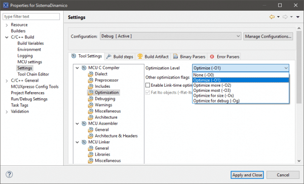 Existe, ainda, outra solução para melhora do desempenho, que é utilizar a otimização do compilador. Na IDE MCUXpresso esta opção está disponível nas configurações de projeto.