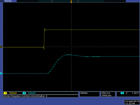 Em amarelo está a entrada do sistema e, em azul, a saída. Esta resposta é bastante semelhante àquela feita a partir do processamento da equação utilizando coeficientes em ponto flutuante, a qual foi apresentada nos artigos anteriores. Percebe-se, então, que seu comportamento continua satisfatório.