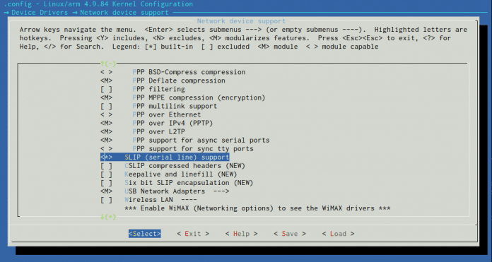Neste exemplo, o SLIP não vem habilitado por padrão no kernel. Seguimos estas instruções para recompilá-lo, habilitando como built-in a opção Device Drivers -> Network device support -> SLIP (serial line) support, e então gravá-lo na placa.