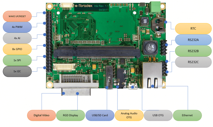 O grande efeito de uma padronização na pinagem dos módulos é a possibilidade de alterar o módulo e, consequentemente, o poder de processamento sem realizar nenhuma alteração no hardware da placa base. Tome como exemplo a placa base Iris, ela é compatível com qualquer módulo da família Colibri e externaliza diversas interfaces do padrão Colibri conforme a figura abaixo.