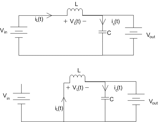 Bem, já sabemos o que nosso conversor vai controlar, vamos revisar rapidamente como funciona um conversor Buck. A figura abaixo mostra os dois possíveis estados de um conversor desse tipo: