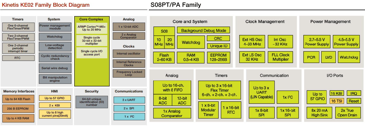 É pino compatível com a família S08P de 8 bits, lançada já a alguns anos. Veja o diagrama de blocos abaixo da subfamília KE02, e o compare com o do SO8P.
