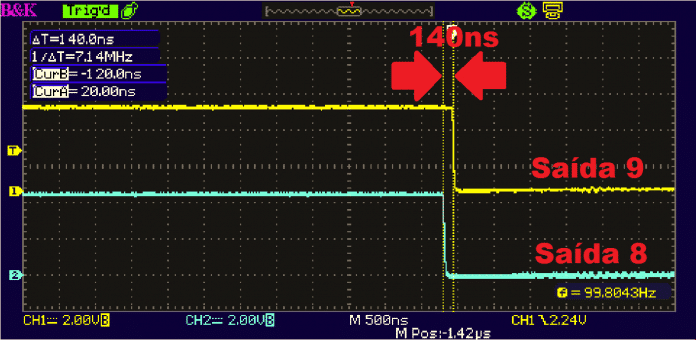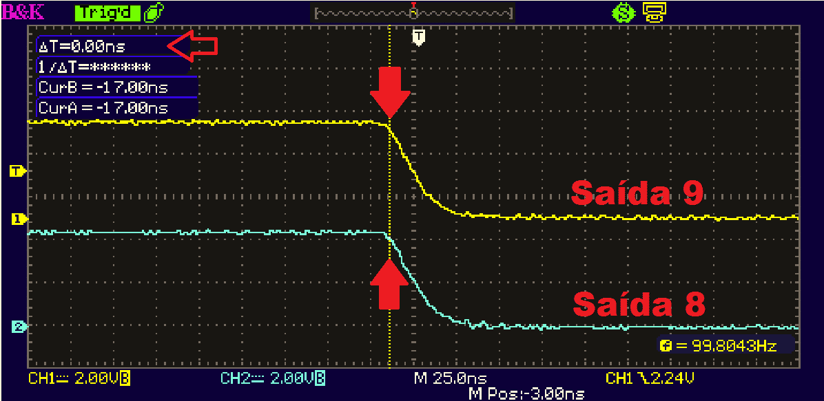 Temos ambas saídas ligando e desligando simultaneamente com o tempo ∆T = 5 ms como programado, perfeito!