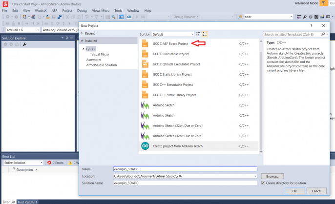 O exemplo abaixo executa uma conversão analógica-digital quando o botão for pressionado e acende o Led 0. Para a criação do projeto utiliza-se o ATMEL STUDIO 7 e o Atmel Software Framework (ASF) seguindo os passos abaixo: