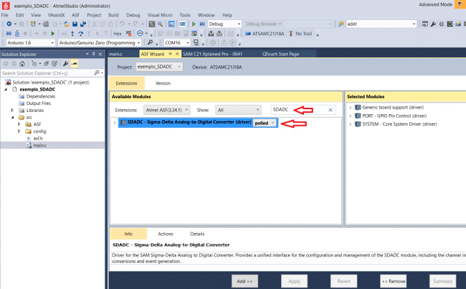 Passo 5 – Adicionar o driver do SDADC clicando no ícone e na área de busca digite SDADC: