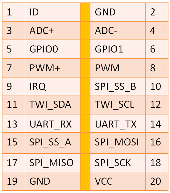 Os engenheiros da ATMEL tiveram uma idéia bem legal quando desenvolveram a forma como foram ligados desses pinos aos conectores – eles disponibilizaram 3 headers (conjunto de pinos) que possuem as mesmas funções. Cada conjunto de pinos contém 20 pinos e possuem as funções conforme a figura ao lado. O que isso ajuda? Bom, caso o projetista queira desenvolver uma placa própria, ele pode projetar três placas iguais que poderão ser interfaceadas da mesma forma. Caso, no entanto, deseje fazer um cabo para conectar a uma placa externa, errar é mais difícil, uma vez que todas as pinagens são iguais. Perceba que, mesmo se ligar ao contrário o cabo, não queimaria a placa Xplained PRO (e também não funcionaria…).