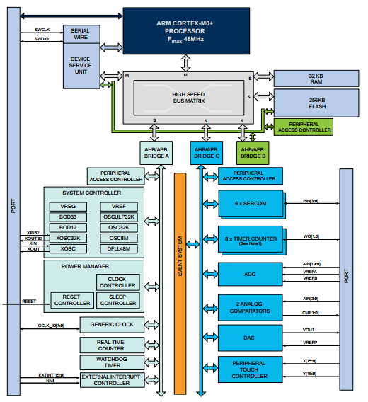 Veja no diagrama de blocos acima que existe um sistema em laranja que comunica com o barramento de periféricos. Este é um sistema que permite que os periféricos cooperem entre si, sem que seja utilizado nenhum recurso de CPU ou de barramento. Funciona assim: você pré-define uma determinada sequência de ações – se alguma coisa acontece em um periférico, ele faz com que uma reação aconteça em outro periférico e, independente do que a CPU está fazendo, isso tudo vai acontecer em dois ciclos sempre. Esse sistema já existia no XMEGA e foi incorporado ao ARM CORTEX M0+ D20. Como é um sistema que funciona também de forma assíncrona, pode operar sem clock presente, em situações de baixo consumo. Por isso tudo poder funcionar sem que o núcleo esteja acordado, foi nomeado de SleepWalking, patente da ATMEL.