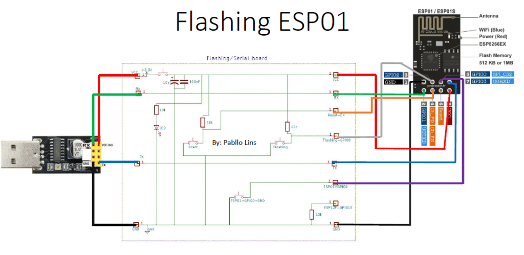 Conexões dos terminais: https://github.com/Pabllolins/My_Flashing_board_for_Espressif_Modules/blob/master/Schematic/Wiring_ESP01.pdf