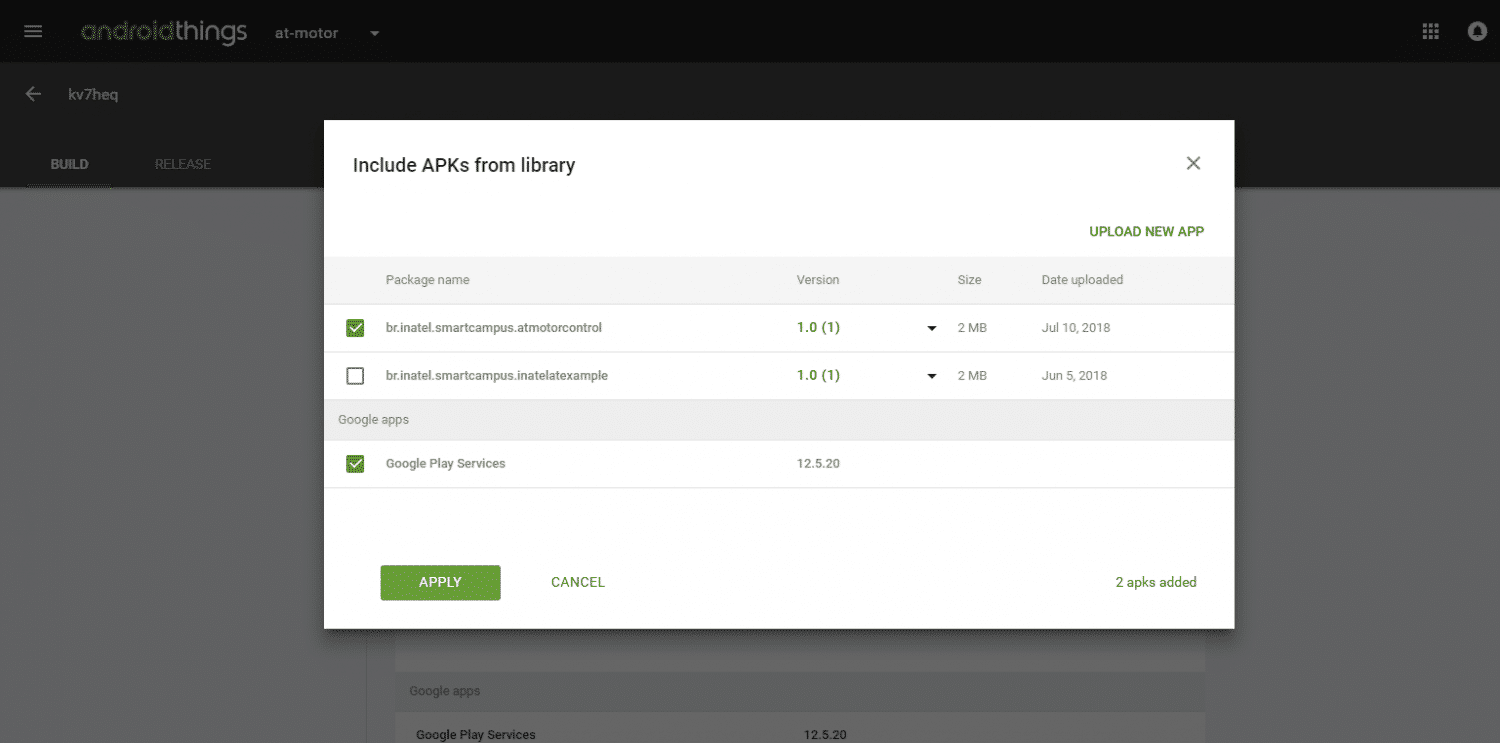 Crie um novo apk, envie e para o console do android things. Acessando o menu “App libary”, selecione o seu App e pressione o botão “UPLOAD a NEW VERSION”. Feito isso podemos testar a atualização OTA.