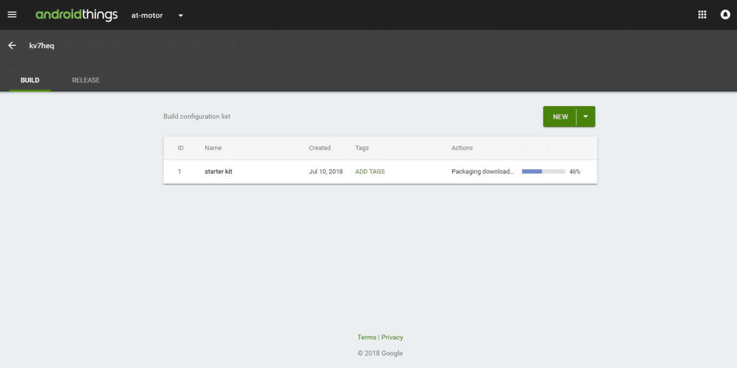 Android Things Setup Utility (version 1.0.20) ============================ This tool will help you install Android Things on your board and set up Wi-Fi. What do you want to do? 1 - Install Android Things and optionally set up Wi-Fi 2 - Set up Wi-Fi on an existing Android Things device 1 What hardware are you using? 1 - Raspberry Pi 3 2 - NXP Pico i.MX7D 1 ou chose Raspberry Pi 3. etting up required tools... etching additional configuration... ownloading platform tools... ile already downloaded. nzipping platform tools... inished setting up required tools. aspberry Pi 3 o you want to use the default image or a custom image? - Default image: Used for development purposes. No access to he Android hings Console features such as metrics, crash reports, and OTA pdates. - Custom image: Upload your custom image for full device evelopment and anagement with all Android Things Console features. 1 ownloading Android Things image... ile already downloaded. nzipping image... ownloading Etcher-cli, a tool to flash your SD card... File already downloaded. Unzipping Etcher-cli... Plug the SD card into your computer. Press [Enter] when ready ...
