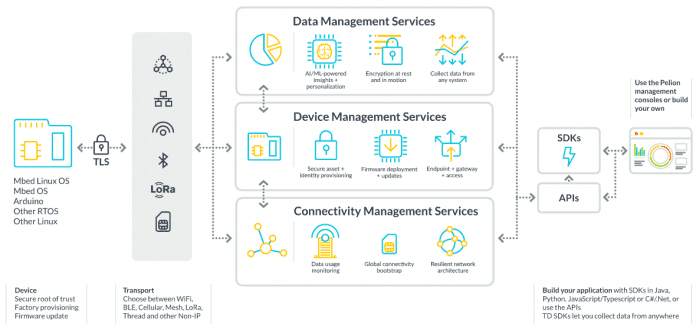 A ARM Pelion consiste em três serviços principais de IoT que podem ser combinados ou usados separadamente com base nos requisitos do produto. O gerenciamento de conectividade, dispositivos e dados se dispoem a resolver os desafios comuns à maioria dos projetos de IoT,