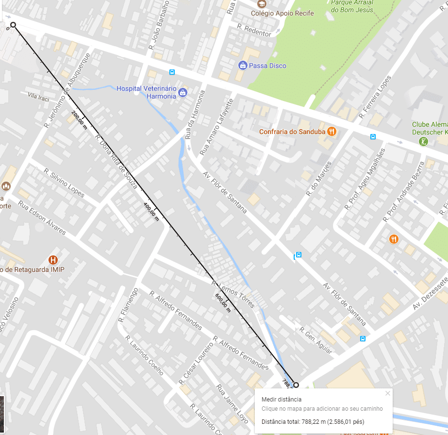 O melhor alcance obtido numa área urbana em Recife – PE (Figura 15) foi de cerca de 800 metros, contando com a presença de vários prédios entre os módulos. Comparando o resultado com relatos de outras pessoas em fóruns, o meu resultado apresentado é, de certa forma, ruim. Outras opções também para o aumento do range da comunicação é uma melhor configuração da antena e parâmetros da comunicação.