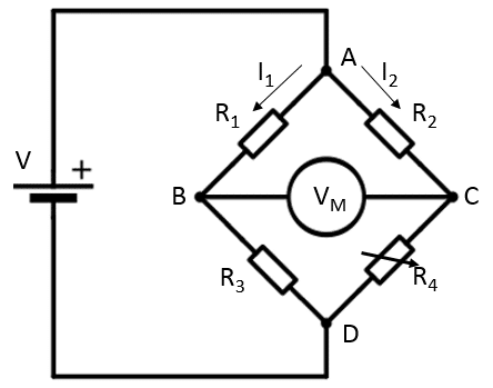 Ou seja, em caso de resistências iguais, a tensão medida em Vm é nula, igual a zero.