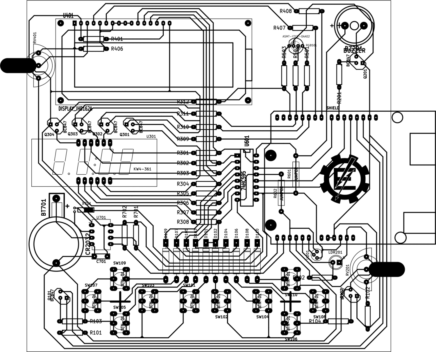 Com relação ao projeto do layout da placa, este foi planejado para ser possível de ser fabricado em face única. Isto permite a confecção caseira da placa de modo rápido e simples. Além disso, todos os traços possuem a espessura mínima de 15 mils (0,381mm), com isolação de 30 mils (0,762mm). Isto reduz a possibilidade de curtos ou problemas de corrosão na fabricação caseira da placa. Por esse motivo algumas providências tiveram que ser tomadas para garantir essas premissas: