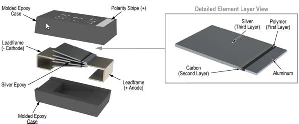 Internamente, vários elementos de folha metálica são empilhados e posicionados dentro da construção do capacitor, o que é em grande parte responsável pelo ESR muito baixo (Figura 3).