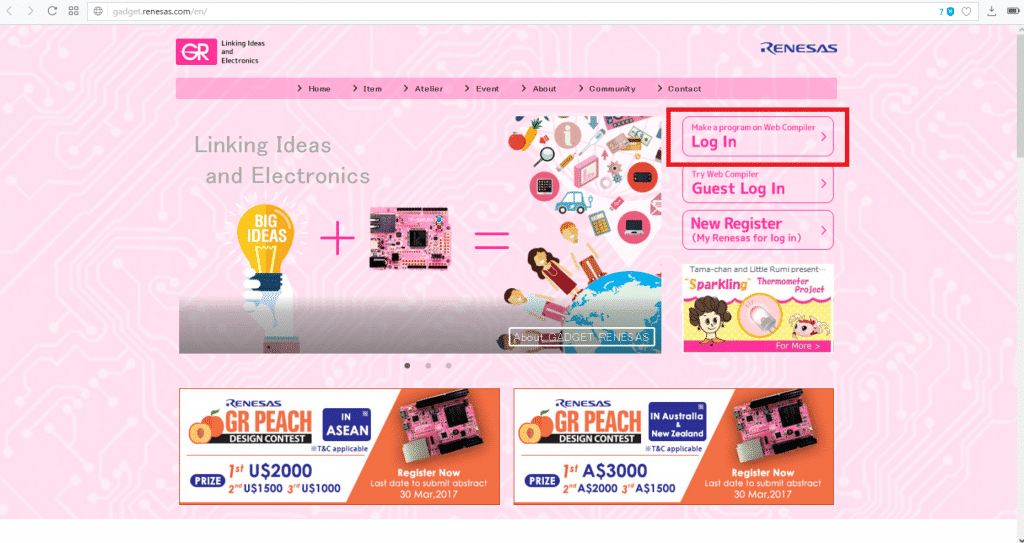 Além da GR-Peach, o Renesas Web Compiler oferece fácil interface com as demais placas da série Gadget Sakura. Você tem a possibilidade de compilar e baixar seus programas e transferí-los para a plataforma desejada.