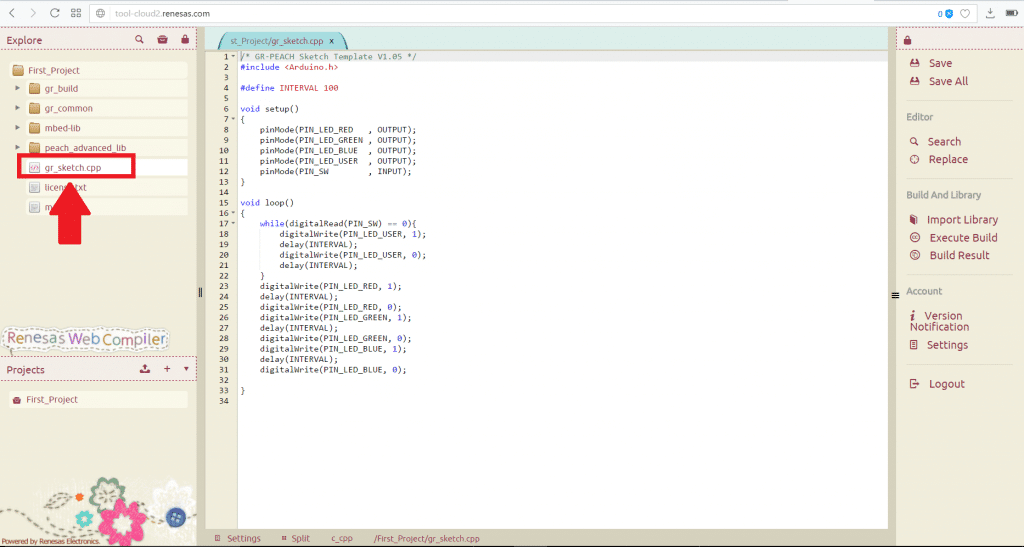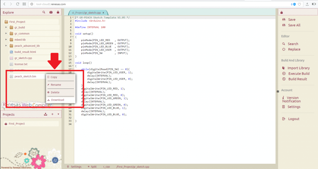 Depois de realizar o login, você será redirecionado à página Renesas Web Compiler. Aqui você deve selecionar o template que receberá seus programas. Usaremos a opção GR-PEACH_Sketch_v1.05.zip.
