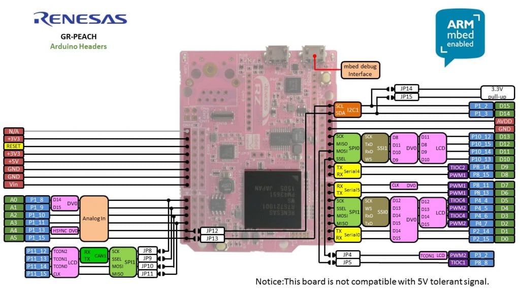 Um segundo passo é utilizar os pinos GPIO da placa. Ela dispõe de uma pinagem compatível com Arduino Uno, porém possui muitos outros pinos com periféricos adicionais. Visite o site MBED para mais informações artigo anterior. Na próxima figura temos o esquemático dos pinos compatíveis com Arduino: