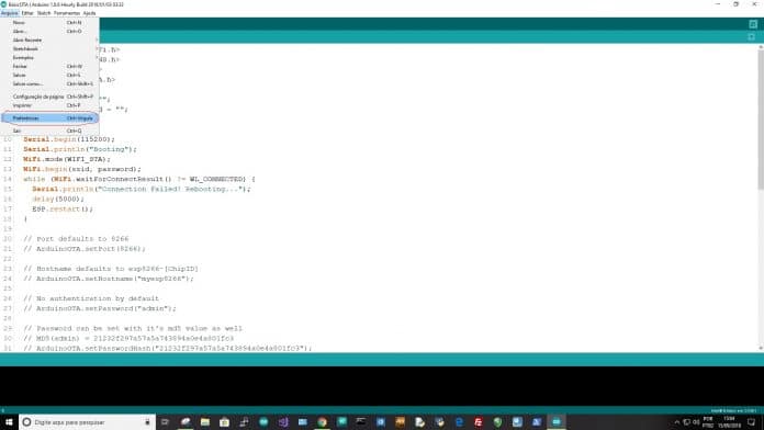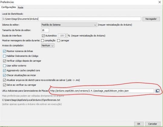 2) Na IDE Arduino, ir em “Preferências” >> Configurações >> Clonar URL JSON Fornecida acima >> De “Ok”.