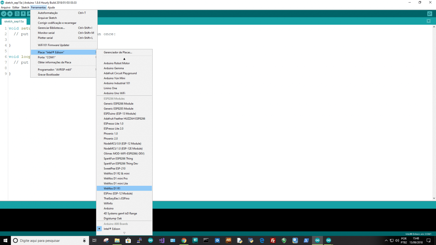 4) Para encontrar a placa Wemos, reinicie a IDE e siga conforme a imagem abaixo. Terminado! Vamos começar a programar!