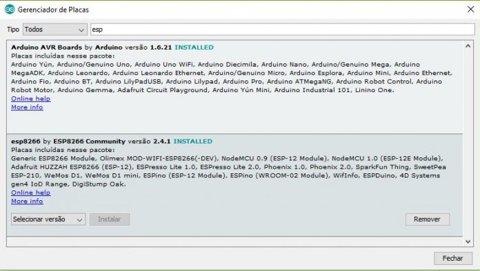 3) Encerre a IDE do Arduino e vá em “Gerenciador de Placas” >>” esp8266” >> ”Instalar Pacote”. A imagem abaixo demonstra os passos. Já tenho instalado este pacote. Mas se não tiverem na sua IDE, a opção “Instalar” e “Versão” serão exibidas. Escolha a última versão estável e clique em “instalar”. Pronto! Sua IDE reconhecerá a placa e estará pronta para começar.