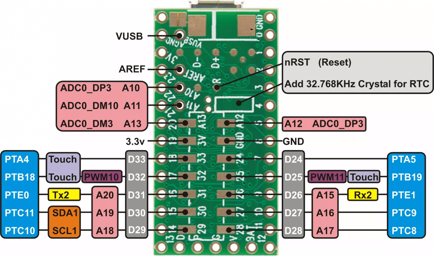 Dessa forma é possível criar programas no mbed, aproveitando as bibliotecas, recursos e toda a facilidade que a ferramenta proporciona. A pinagem da Teensy é mostrada a seguir: