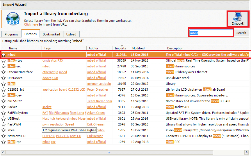 Procure por mbed e selecione a biblioteca mbed na lista, depois a importe para o projeto: