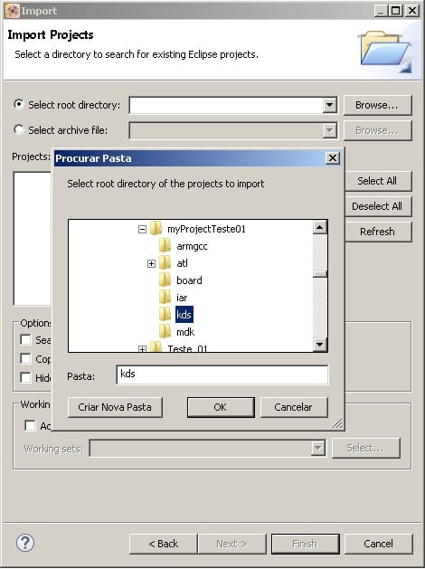Selecionar a opção “Select root directory”. Clicar em “Browse”. Selecionar a pasta do projeto, de acordo com o que foi apresentado no programa de geração de projetos. Escolher a pasta kds.