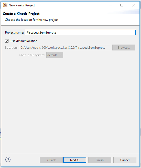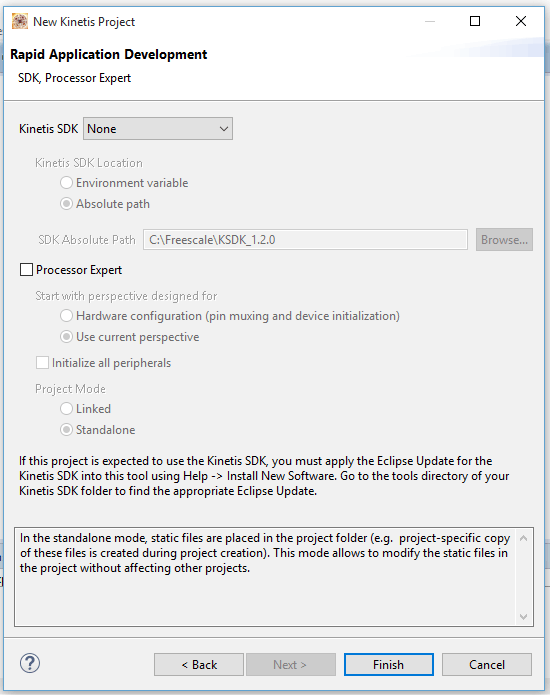 Clicar em “Next”. No combo box do “Kinetis SDK”, selecione “None”. Deixe o checkbox do “Processor Expert” desabilitado.