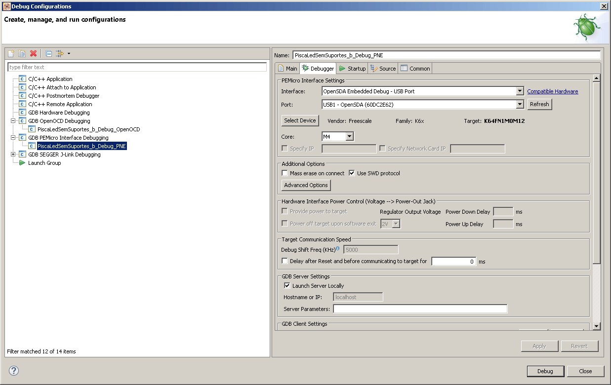 Selecionar a opção “Debug Configurations” > “GDB PEMicro Interface Debugging” > “PiscaLedSemSuportes_Debug_PNE”. Selecionar a aba “Debugger”.