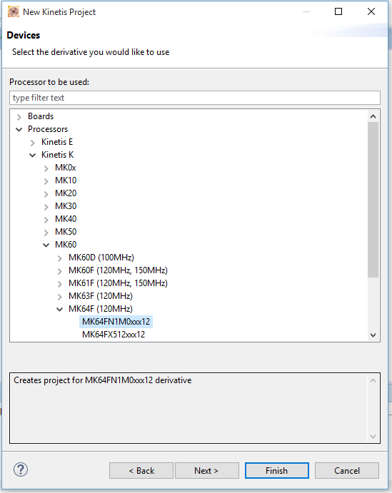 Clicar em “Next”. Selecione “Processors -> Kinetis k -> MK60 -> MK64F (120MHz) -> MK64FN1M0xxx12”.