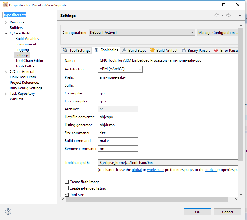 Siga o seguinte caminho: “C/C++ Build -> Settings -> Toolchains”. Marcar o checkbox “Print size”.