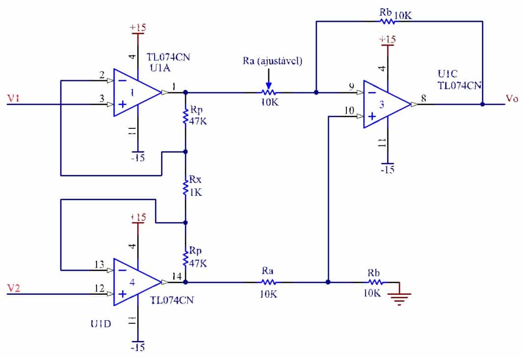 Para este estágio utilizaremos o circuito clássico de amplificador de instrumentação com 3 amplificadores operacionais e suas fórmulas conhecidas. Foi escolhido para este projeto o TL074CN que apresenta alta taxa de rejeição em modo comum (CMRR) pois os amplificadores mais comuns como o 741 não atenderia este requisito. O circuito deste estágio é mostrado abaixo: