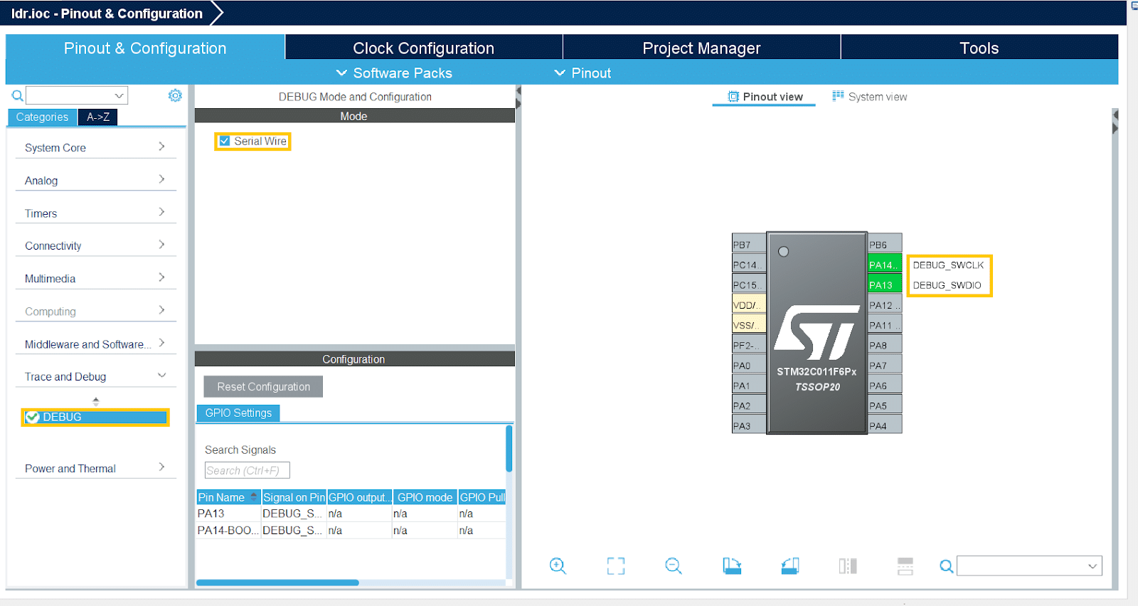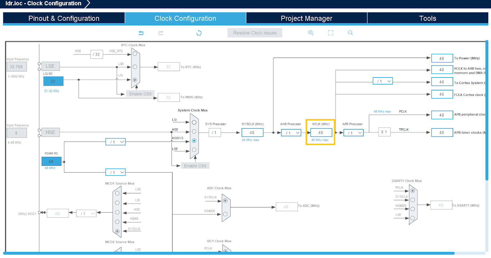 - Vá para a página de configurações de relógio e em HCLK digite 48 MHz para a frequência de saída desejada do sistema. Pressione a tecla “Enter” e deixe o aplicativo resolver os divisores/multiplicadores PLL necessários para atingir a taxa de clock desejada. Depois volte para a página de configuração dos pinos, selecione “Trace and Debug” e habilite “Serial Wire.