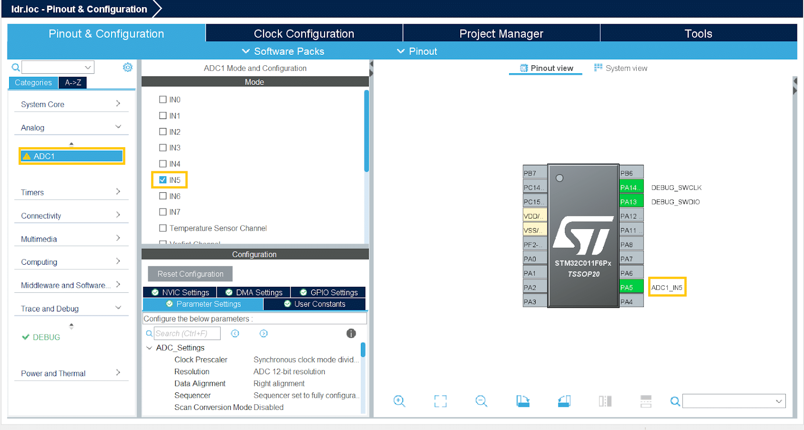- Em Analog > ADC1 habilite o “IN5” e mantenha as demais configurações ADC no modo padrão.