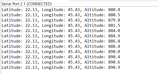 Abra novamente o monitor serial e o esperado é a exibição da latitude, longitude e altitude como na imagem abaixo.