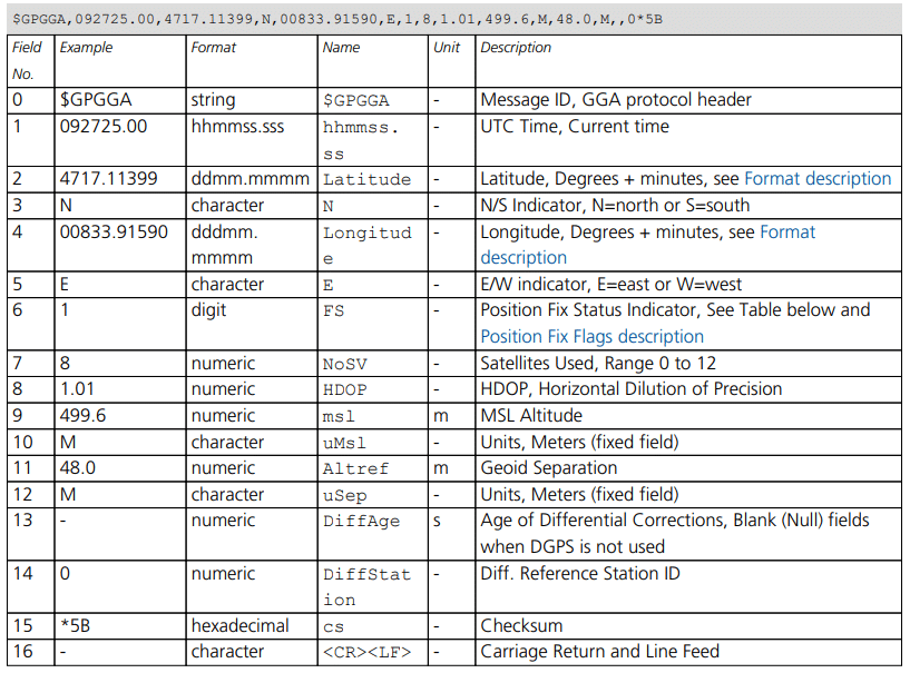 - $ GPGGA fornece dados de correção essenciais de localização 3D e com precisão.