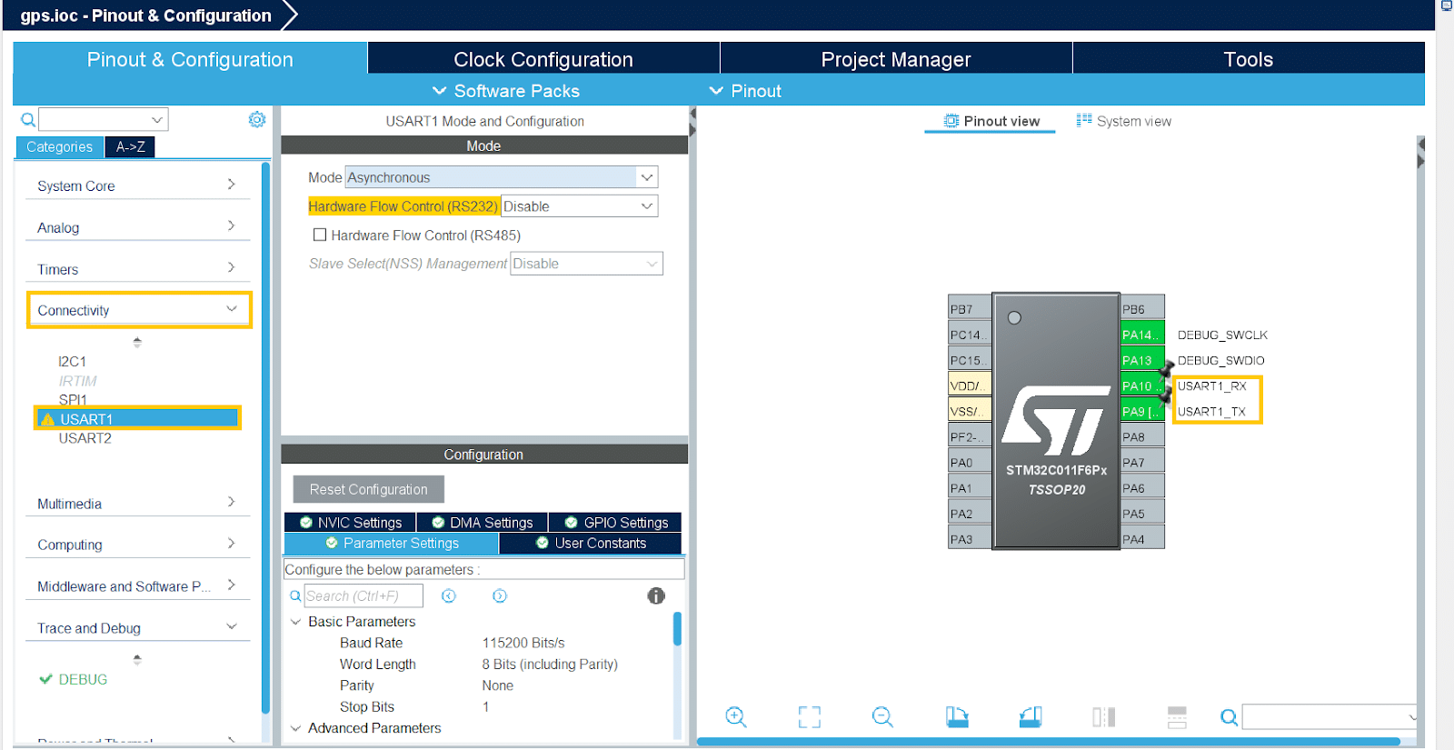 - Para receber os dados do GPS vamos configurar os pinos PA2 e PA3, respectivamente como USART2_TX e USART2_RX. Depois, em Connectivity > USART2 habilite o modo assíncrono e mude o Baund Rate para 9600, as demais configurações mantenha.
