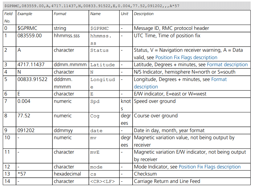 - $GPRMC fornece hora, data, latitude, longitude, altitude e velocidade estimada.