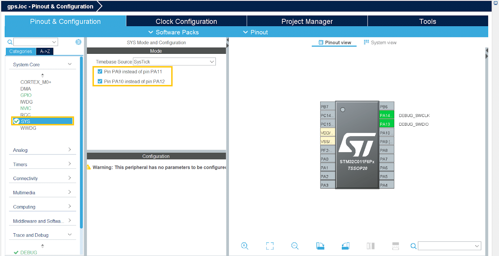 - Em System Core > Sys habilite Pin PA9 e Pin PA10.
