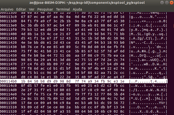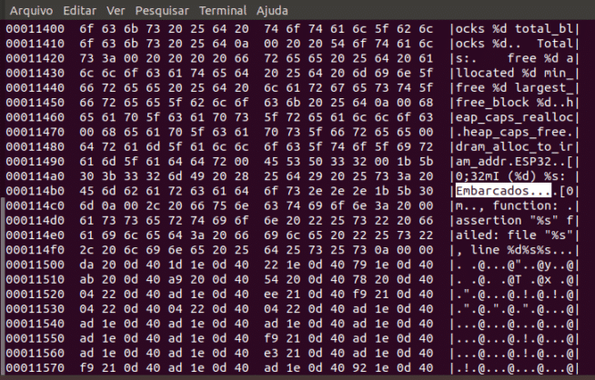 Sabendo que este ESP32 não está protegido, podemos exportar o conteúdo da flash e usar para clonagem, engenharia reversa ou o que der na cabeça! Vamos ver se achamos a palavra usada no ESP_LOGI(), “Embarcados…”, ao ler o conteúdo da memória: